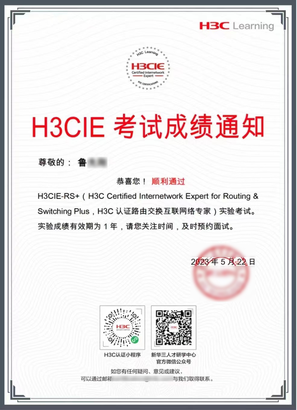 【喜報】恭喜魯同學通過H3CIE-RS+實驗考試