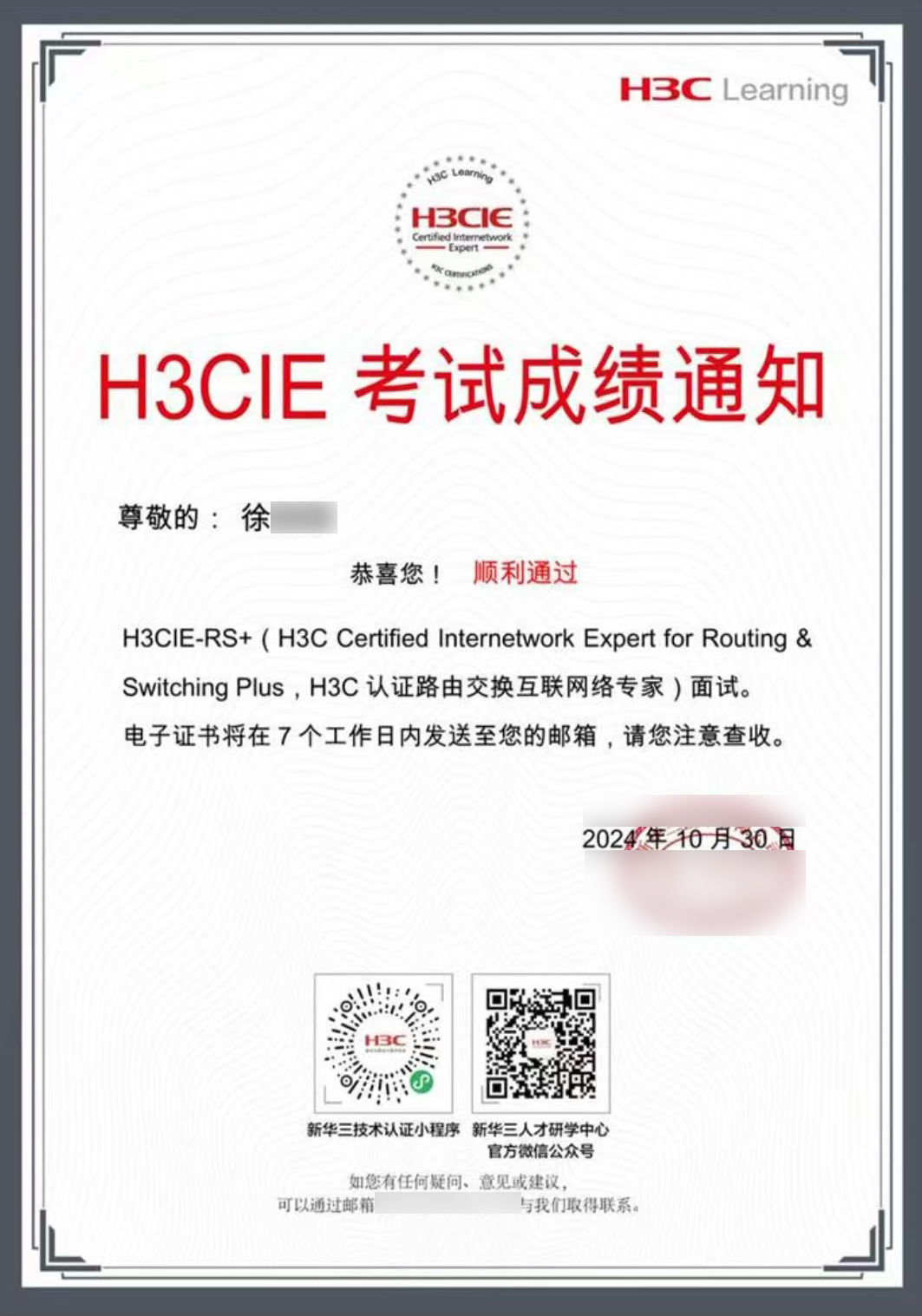【喜報】恭喜徐同學通過H3CIE-RS+面試