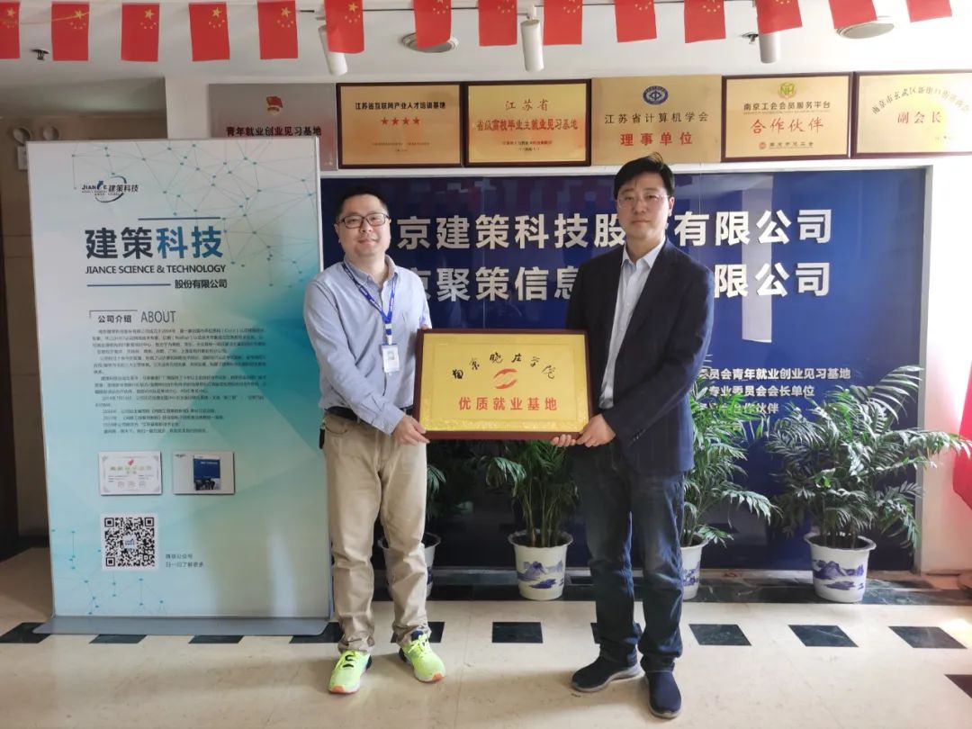 最后,因為建策科技自2014年開始持續支持曉莊學院的就業工作,學院為建策科技頒發了“南京曉莊學院優質就業基地”牌匾,未來建策也會繼續配合學院做好就業工作,把雙方合作持續長久的進行下去。